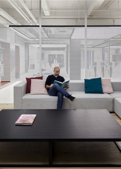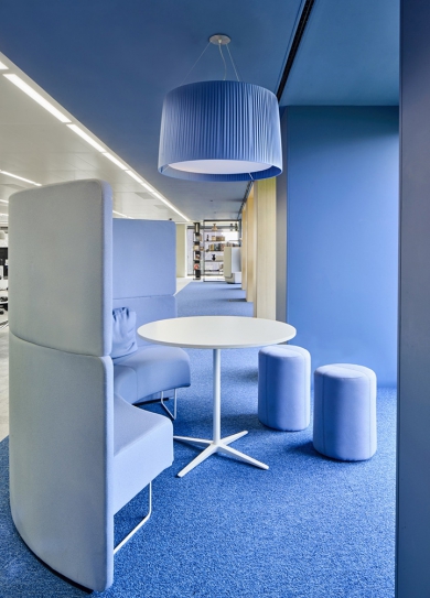 項(xiàng)目位于西班牙巴塞羅Dau大樓的六樓,主要用于西班牙金融服務(wù)公司Caixabank的創(chuàng)新和營銷部門。整體辦公室裝修設(shè)計(jì)以藍(lán)、黃為主體配色,這來自于公司的形象標(biāo)識(shí),也最終成就了本案令人驚嘆的空間視覺效果。藍(lán)色是本案的重點(diǎn)色彩表達(dá),以最極致的方法呈現(xiàn)于會(huì)議室和休息區(qū)的墻面、頂面和地面,以色彩形成一個(gè)極具獨(dú)立性的空間。 頭腦風(fēng)暴室運(yùn)用輕柔的木飾面和淺色的地毯,來營造一個(gè)寧靜和舒適的空間氛圍。此