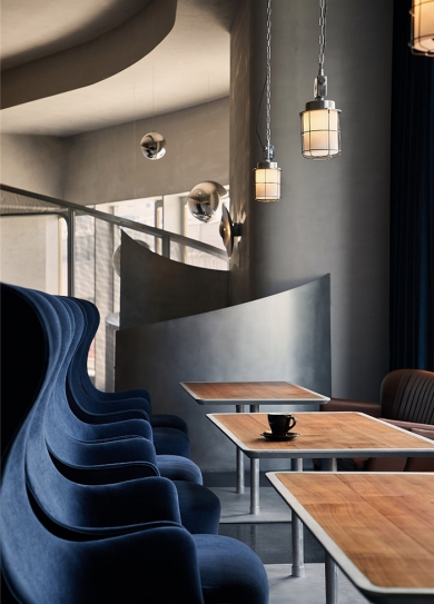 標(biāo)簽: 豐田辦公室裝修設(shè)計(jì) 辦公室裝修設(shè)計(jì)方案 READ MORE三谷是一家綜合業(yè)態(tài)的餐吧,白天是西餐模式,夜晚則變成一家酒吧。這樣的復(fù)合業(yè)態(tài),既要保證餐廳的通透性,又要保持酒吧模式相對(duì)的神秘感。于是,餐廳裝修設(shè)計(jì)公司運(yùn)用斐波那契螺旋線做了一個(gè)玄關(guān)。螺旋的曲線起到了引導(dǎo)人流的作用,也提供了相對(duì)的私密性。金屬網(wǎng)作為隔斷材質(zhì),契合主題又保證相對(duì)的透光性。 在色彩上專業(yè)餐廳裝修公司選擇了大部分的灰色作為基底,為了契合主題,在點(diǎn)綴色上使用了郵輪經(jīng)典的紅藍(lán)配色。