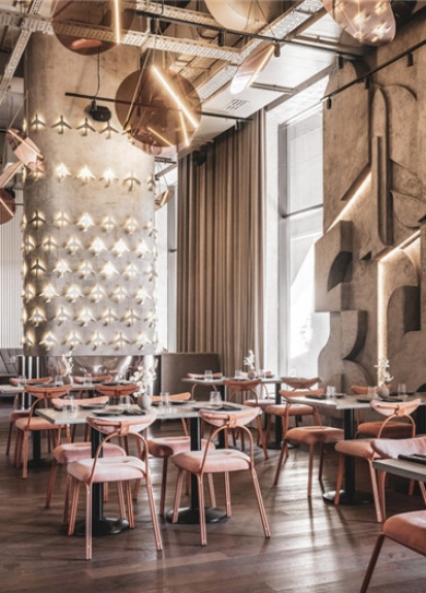 標(biāo)簽: 集團(tuán)總部辦公設(shè)計(jì) 辦公樓裝修設(shè)計(jì)方案 READ MORE設(shè)計(jì)的想象力是無(wú)極限的,跨越時(shí)空,可以向外太空索取靈感。Polet餐廳的內(nèi)部裝潢讓人仿佛置身科幻電影的場(chǎng)景之中。入口光滑的鋼結(jié)構(gòu)和舷窗使房間看起來(lái)就像航天飛船的機(jī)艙。極簡(jiǎn)主義風(fēng)格的Polyot餐廳內(nèi)部并未采用莫斯科餐廳中常見(jiàn)的圖案裝飾,而是用懸掛的閃亮大型物件加以替代。下面就跟隨鄭州餐廳裝修設(shè)計(jì)公司宏鈺堂小編一起來(lái)欣賞吧! 常常出現(xiàn)在好萊塢新世界電影中的銀色火星女神也以雕像的形式被設(shè)置在