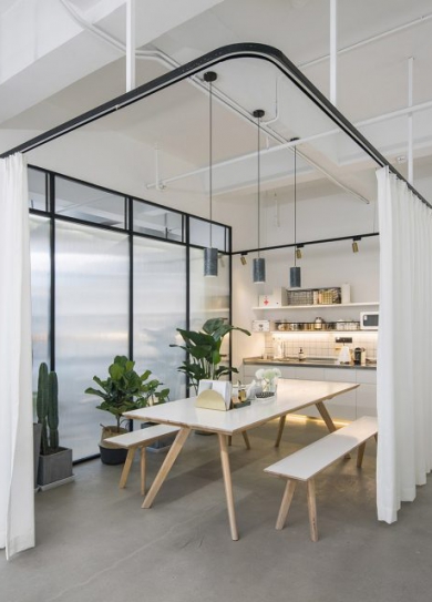 標簽: 辦公室裝修方案 現(xiàn)代工業(yè)和東方自然共存的辦公室裝修 READ MORE十間工作室的室內(nèi)設計意在營造一種干凈、明亮、寬松的創(chuàng)意氛圍,同時兼顧空間和功能的多變及靈活性。下面鄭州辦公室裝修公司宏鈺堂裝飾就帶大家一起欣賞一下。 工作室以黑白色調(diào)為主,采用開放式天花和素混凝土地面,暗示了極簡、中性的設計哲學。室內(nèi)辦公區(qū)形成一個流動、通透的Studio式大空間,不設任何全封閉的隔間。會議室、辦公室均采用瓦楞藝術玻璃折疊門,平時完全開敞,僅在有需要時關閉,提供視覺和聲學的私